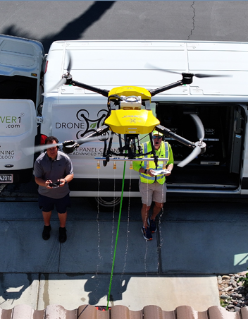 Our drones efficiently deliver pure, deionized spot free water through multiple nozzles at low pressure, while the propeller blades function like a blow dryer. This unbeatable method sets a new standard in the industry.